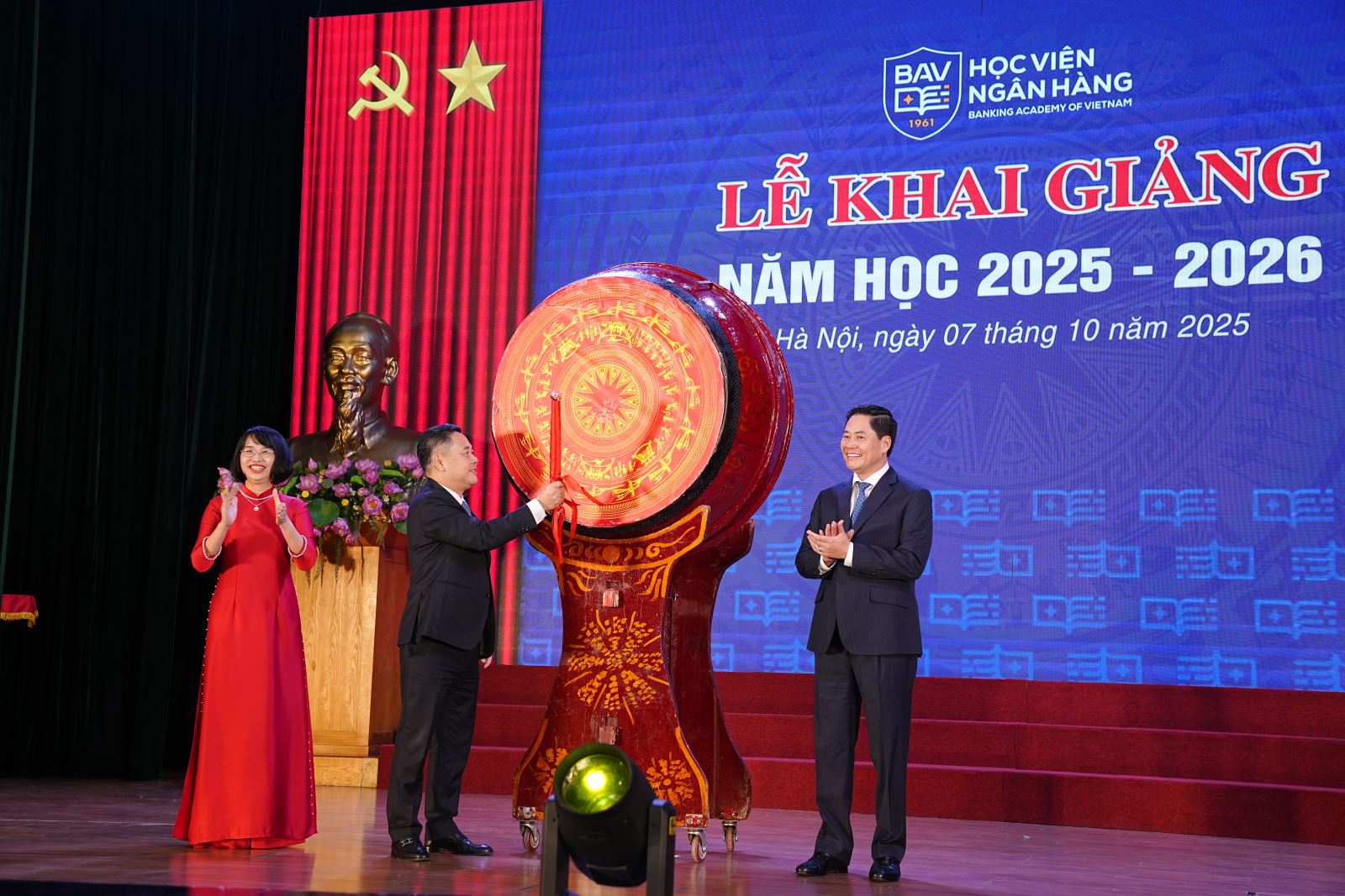 Ngay sau bài phát biểu, Phó Thống đốc đã đánh trống khai giảng, chính thức mở ra năm học mới 2025 - 2026 tại Học viện Ngân hàng.