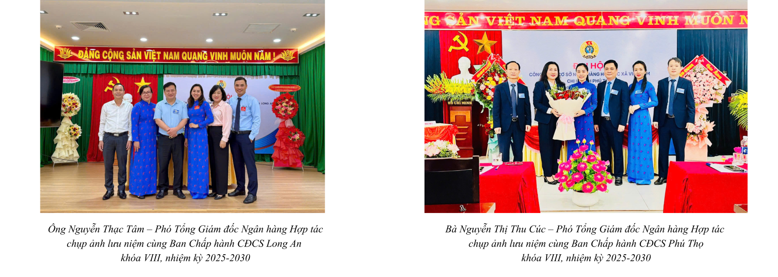 Ngày 08-09/11/2025, các Đại hội công đoàn cơ sở đợt 1 đã diễn ra tại 10 chi nhánh Ngân hàng Hợp tác: Bắc Ninh, Bắc Giang, Hải Phòng, Bình Định, Thái Bình, Vĩnh Phúc, Phú Thọ, Hà Tĩnh, Long An, Tây Ninh… Với phương châm “Đoàn kết - Dân chủ - Kỷ cương - Đổi mới - Phát triển”, Đại hội là dịp để cán bộ, đoàn viên cùng nhìn lại chặng đường đã qua, xác định rõ mục tiêu, phương hướng và quyết tâm xây dựng tổ chức công đoàn ngày càng vững mạnh, phát triển trong giai đoạn mới.