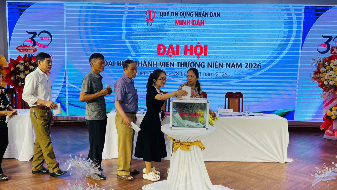 Sáng ngày 28/3, QTDND Minh Dân đã tổ chức Đại hội đại biểu thành viên thường niên năm 2026. Dự Đại hội có đồng chí Lê Trọng Dũng - UVBTV Đảng ủy, Phó Chủ tịch UBND xã; đồng chí Nguyễn Văn Sơn, Phó Chủ tịch UBND xã; các đồng chí nguyên là thành viên Hội đồng quản trị, Giám đốc qua các thời kỳ; các đồng chí Bí thư chi bộ, Trưởng thôn và gần 200 thành viên, khách mời.