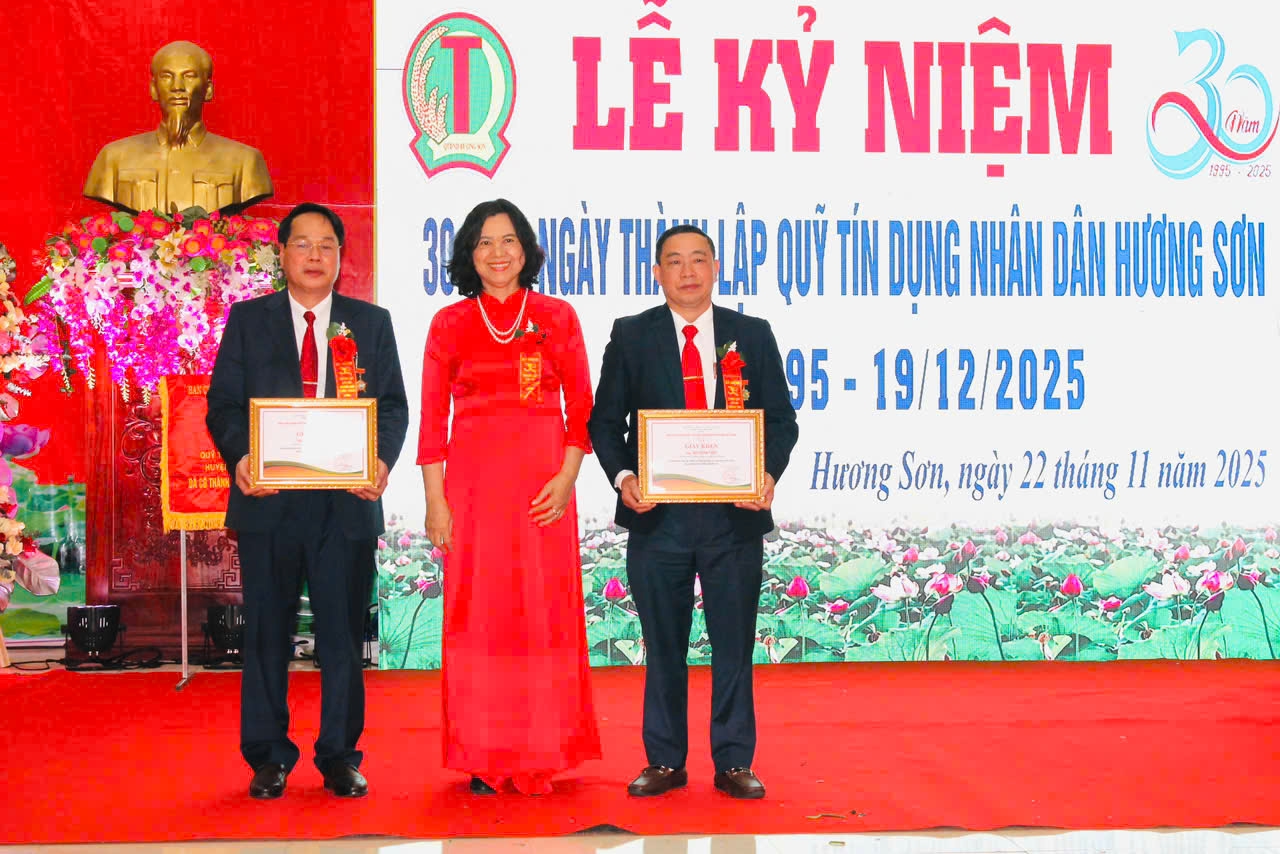 Bà Nguyễn Thị Kim Thanh - Phó TTK Hiệp hội trao giấy khen cho đồng chí Chủ tịch HĐQT và Giám đốc QTDND Hương Sơn