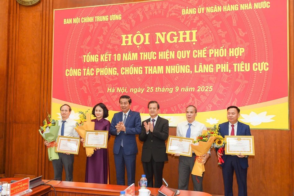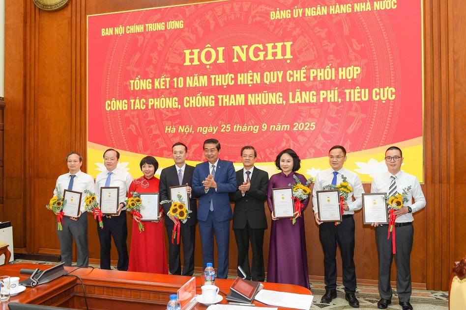 Nhằm biểu dương thành tích, Ban Nội chính Trung ương đã tặng Bằng khen cho 3 tập thể và 4 cá nhân của Ngân hàng Nhà nước có thành tích xuất sắc trong thực hiện Quy chế phối hợp; đồng thời trao Kỷ niệm chương Vì sự nghiệp Nội chính Đảng cho 9 cán bộ ngành Ngân hàng.