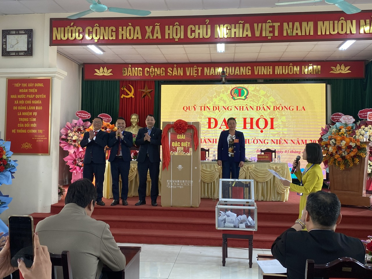 Đại diện lãnh đạo NHNN Chi nhánh khu vực 1 cùng lãnh đạo QTDND Đông La trao giải đặc biệt cho thành viên bốc thăm trúng thưởng.