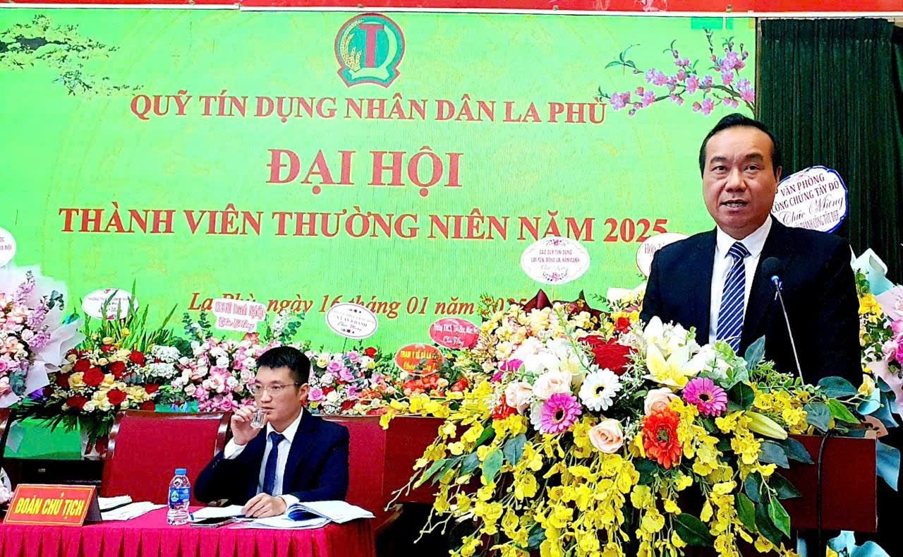 Phát biểu chỉ đạo Đại hội ông Nguyễn Trung Bắc - Phó Phòng Quản lý giám sát các TCTD phi ngân hàng, các TCTCVM và QTDND NHNN Chi nhánh thành phố Hà Nội và Đồng chí Nguyễn Duy Giang - PBT, Chủ tịch UBND xã La Phù ghi nhận, biểu dương đánh giá cao hoạt đông QTDND nhân dân La Phù năm 2024. Đề nghị ban lãnh đạo Quỹ tiếp tục nâng cao đổi mới sáng tạo trong việc rõ người, rõ việc, rõ trách nhiệm, kiểm soát điều hành việc kiểm toán nội bộ, tăng cường giám sát, thường xuyên cập nhật văn bản mới áp dụng vào việc thực hiện, điều hành. Đồng thời thực hiện theo luật định hiện hành. Tập trung việc áp dụng công nghệ 4.0 không dùng tiền mặt, thực hiện áp dụng công nghệ chuyển đổi số đề phục vụ nhân dân trong và ngoài xã trong việc cho vay, cần nâng mức vay cho nhân dân, doanh nghiệp vay phù hợp làng nghề.